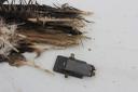 Нашли останки птицы в виде перьев и трекер. Кольца не нашли. Тефлоновые лямки у трекера оборваны в основании - в местах пришивки. Очины перьев перекушены. Вероятно птицу съел другой хищник - возможно беркут
