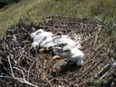 В гнезде 3 птенца, младший из которых не окольцован - слишком мал и кольцо спадает.
