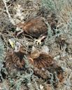 Гнездо на земле в основании бетонной опоры ЛЭП. 3 птенца.