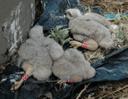 Гнездо на земле в основании бетонной опоры ЛЭП. 3 птенца.