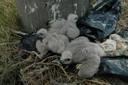 Гнездо на земле в основании бетонной опоры ЛЭП. 3 птенца.
