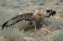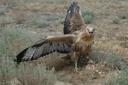 Гнездо на горизонтальной траверсе бетонной опоры ЛЭП в старой постройке степного орла. Как минимум 2 слётка, одного из которых удалось закольцевать