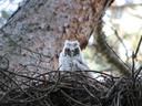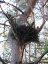 Гнездо в старой постройке ястребиной птицы на сосне на опушке леса. В гнезде 1 оперяющийся птенец. Пластиковое кольцо не надето, т.к. его высота больше длины цевки.