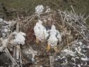 Выводок из трех птенцов, младший слишком мал для кольцевания.
