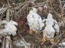 Выводок из трех птенцов, младший слишком мал для кольцевания.