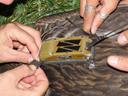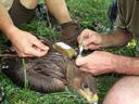 Выводок из трех слетков, на самого крупного из которых установлен ARGOS/GPS передатчик компании Microwave Telemetry, Inc.
