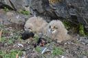 Старший птенец из выводка, состоящего из двух птенцов, в гнезде под скалой.