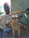 Odilon Gheahnjim: The eagle was caught by some hunters near the Mbam River 10 kms from Bankim on Sunday (13th december 2015) in the afternoon. According to tradition the bird must be presented to the whole village - slaughtered and the meat given to all the Kinds. The feathers are used for the induction of the news King. Roger Nkiven Wikinyuy: I am in Cameroon in northern region in adamawa found an eagle alive in my farm I discovered on her legs two bangles red and yellow with an internet sit on them so I decided to contact you.