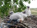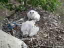 В выводке 2 птенца + 1 яйцо-болтун + 1 яйцо разбито. Самка ранена филином.