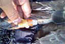 Один из четырех птенцов выводка - троих окольцевали. Взята проба перьевой трубки - пробирка № 864. Доп. измерения: диаметр цевки 9.4 х 9.1 мм. коготь: задн. 23.3 мм. средний 18.3 мм. внутр. 22.2 мм.