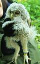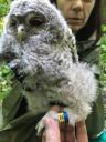 В этом году в большом дуплоне для длиннохвостых неясытей загнездилась серая неясыть. Птенцов в этом ящике обнаружили достаточно поздно - в начале июня. Здесь оказалось четыре крепких достаточно крупных птенца. Птенец с кольцом R-022 самый крупный из четырех. Точный возраст определить не удалось - поскольку пропустили время кладки.