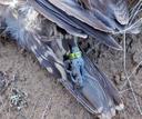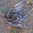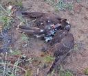 Ширина цевки 7.5 х 7.4 мм / раскрывшийся 5 мах 83 мм / коготь задний 20.4 мм / внутренний 18.3 мм / средний 16.5 мм / наружный 15.5 мм. Труп с трекером найден под гнездовым деревом. Погиб 10.07 - череп пробит в районе правой глазницы. Голова оторвана - висит. Перелом правого крыла. Грудь съедена. Наружный коготь оторван.