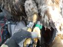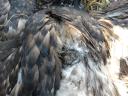 Младший птенец из трех. У птенца имеется рана на левом боку переходящая на спину - что выяснилось только после проведения кольцевания. Вероятно старшие птенцы заклевали его.
