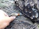 Младший в выводке 4-х птенцов. Длина 5 маха 112.0 мм / ширина цевки 7.7 х 7.7 мм / коготь задний 19.2 мм / внутренний 19.9 мм / средний 16.5 мм / наружный 13.6 мм / пробирка с пером № D-360.
