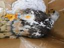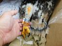 Младший из трех птенцов - подкормили. Длина 5 маха 75.0 мм / ширина цевки 12.9 х 12.6 мм / коготь задний 28.4 мм / внутренний 29.2 мм / средний 24.1 мм / наружный 19.1 мм / пробирка с пером № AN2020-6.