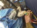 Один из трёх птенцов. Алюминиевое кольцо на правой лапе мы срезали